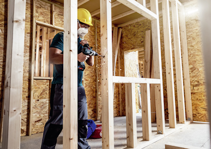 Person i skyddsutrustning borrar träbjälke i en byggnad.