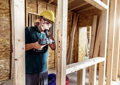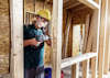 • Person i skyddsutrustning borrar träbjälke i en byggnad.